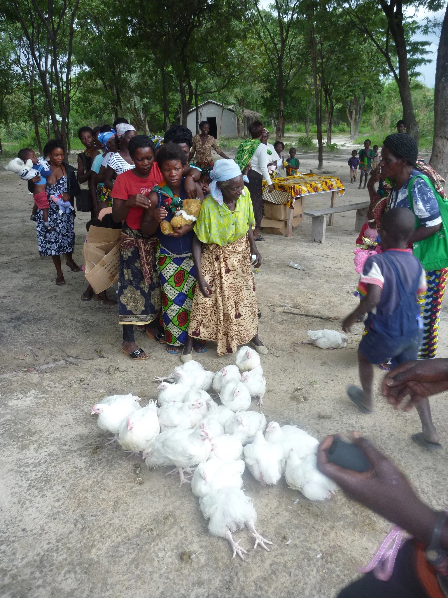 Then it was back out into the sunshine for cake (a treat so rare that some had never had it!), lemonade, snacks and lollipops. Once the food was finished and the children happily playing with toys, I guess it seemed as though the festivities had come to a close. But I'd saved a surprise so huge that at first there was just stunned silence. Then a chorus of cheers erupted. There was a chicken for everyone!!!! The impossible was happening- families were going to have a chicken dinner! One young mom excitedly confided there was no food at home.